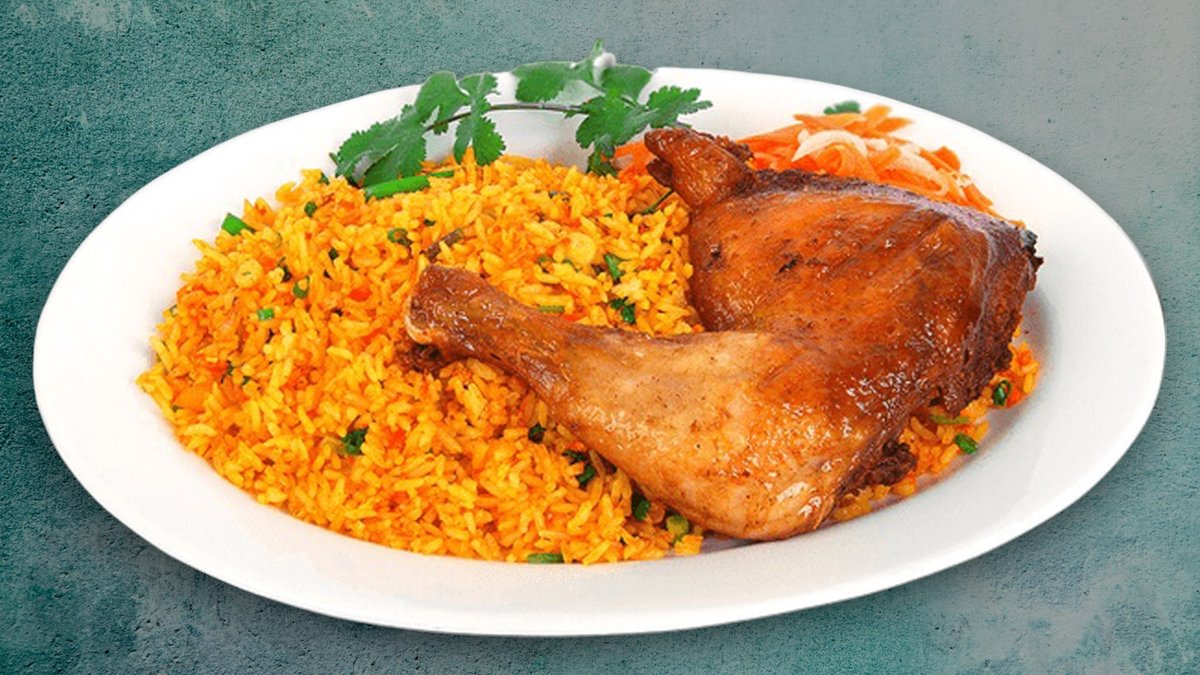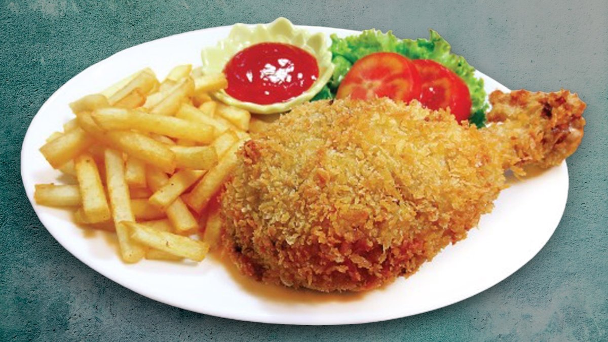 Fried rice, fried chicken leg. Served with a free 0,33 l soda.