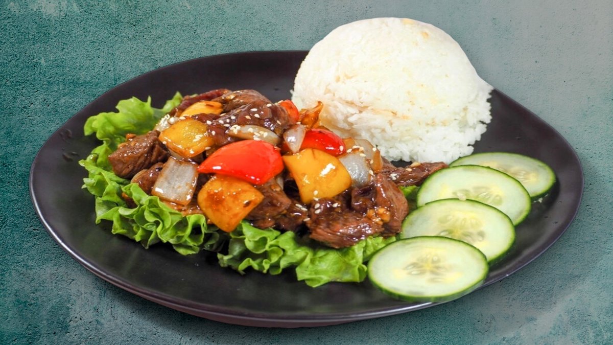Rice with filet mignon cube steak with over a salad. Served with a free 0,33 l soda.
