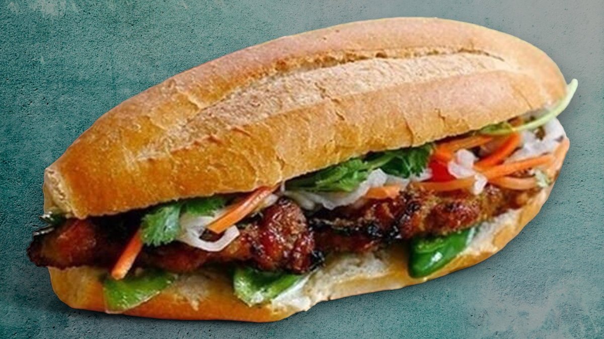 Sandwich with grilled pork, pickled vegetables & creamy mayo