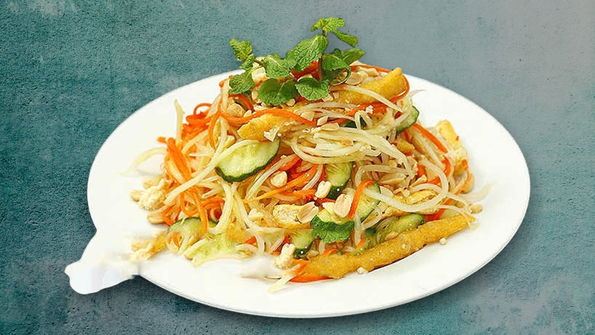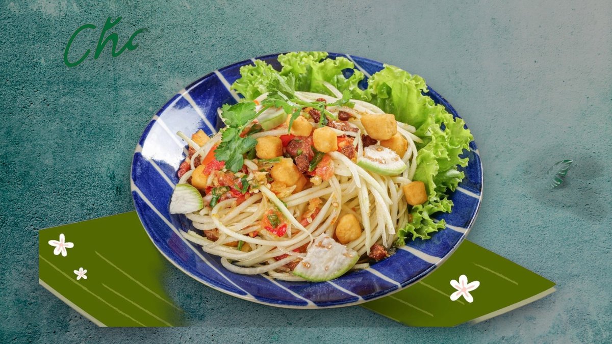 Shredded green papaya topped with beef jerky Papaya, shrimp, pork, mixed herbs and prawn cracker.