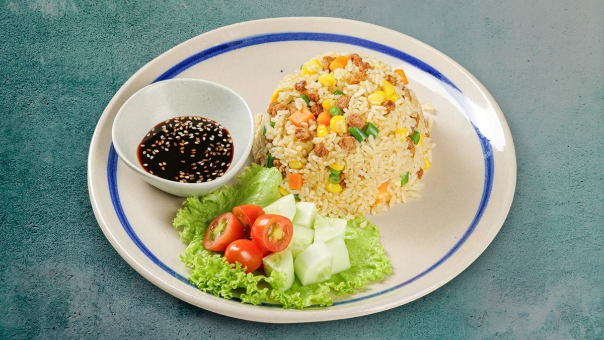 Fried rice tossed with vegetables and vegetarian ham. Served with a free 0,33 l soda.
