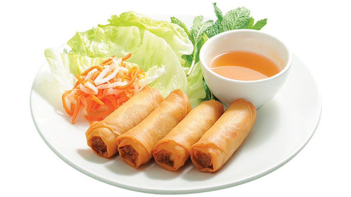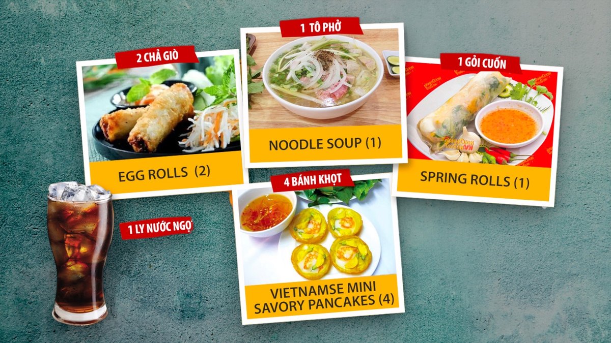 2 egg rolls, 1 noodle soup, 1 spring roll and 4 Vietnamese mini food pancakes. Served with a soft drink of your choice.