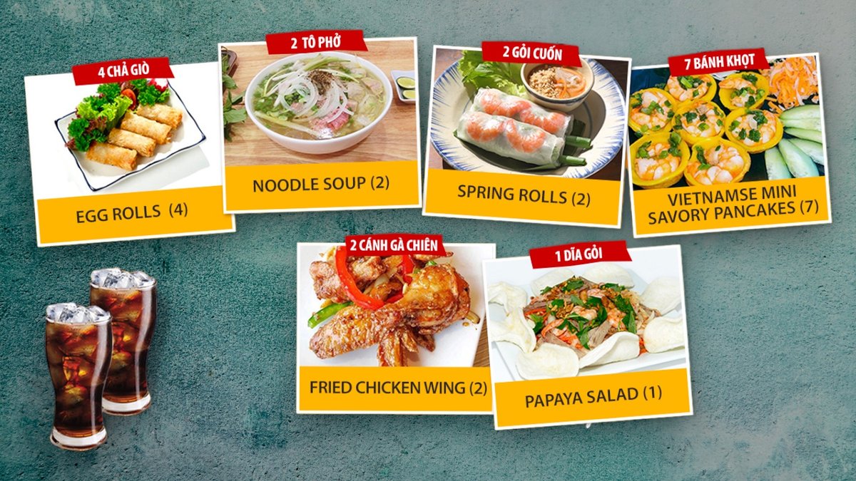 4 egg rolls, 2 noodle soups, 2 spring rolls, 2 fried chicken wings, 1 papaya salad and 7 Vietnamese mini food pancakes. Served with your choice of soft drink.