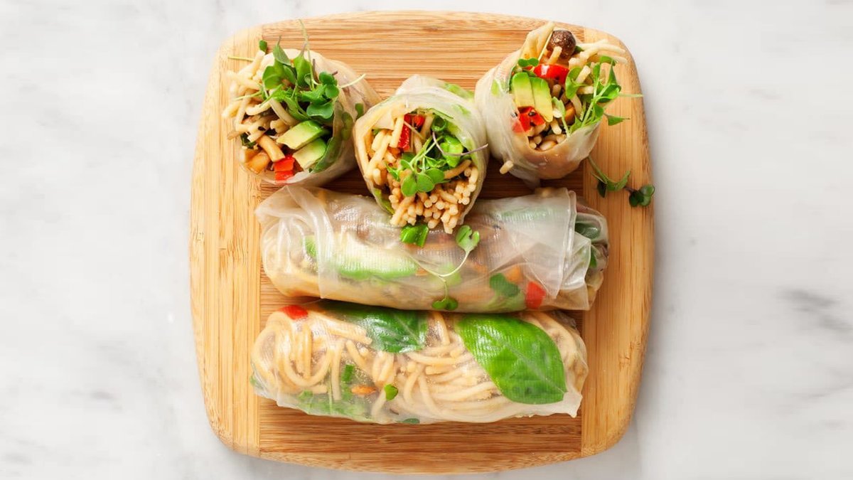Rice Vermicelli & egg rolls. Served with a free 0,33 l soda.