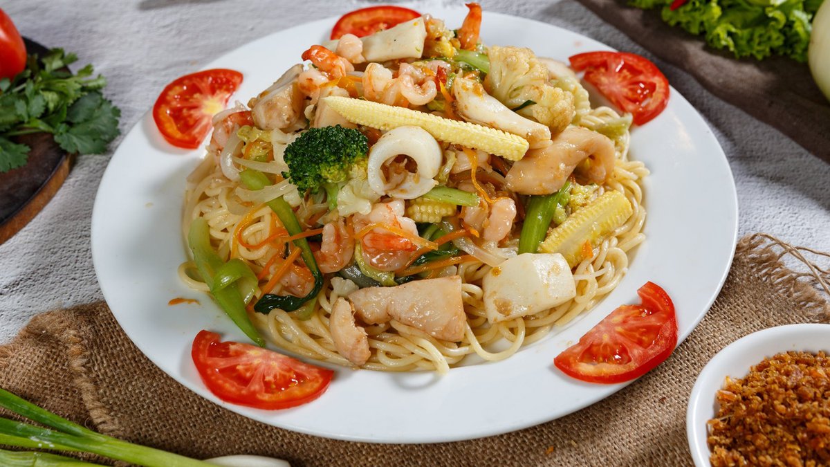 Fried egg noodle with seafood. Served with a free 0,33 l soda.