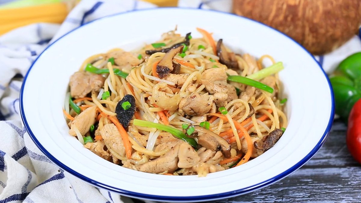 Fried flat rice noodles chicken & vegetables. Served with a free 0,33 l soda.