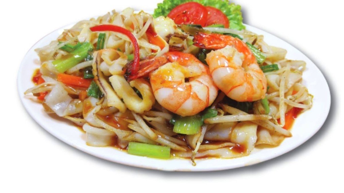 Fried flat rice noodles seafood & vegetables. Served with a free 0,33 l soda.