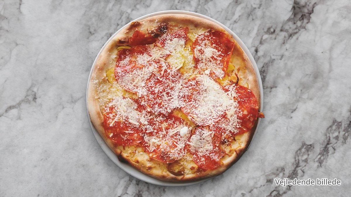 Tomatsauce, ost, italiensk salami, kartoffel, feta og cherrytomater.