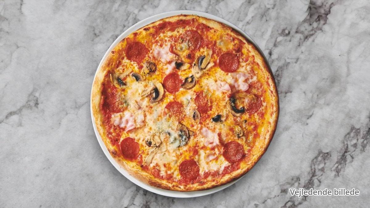 Tomatsauce, ost, kalkunskinke, pepperoni, kalvebacon og cocktailpølser.