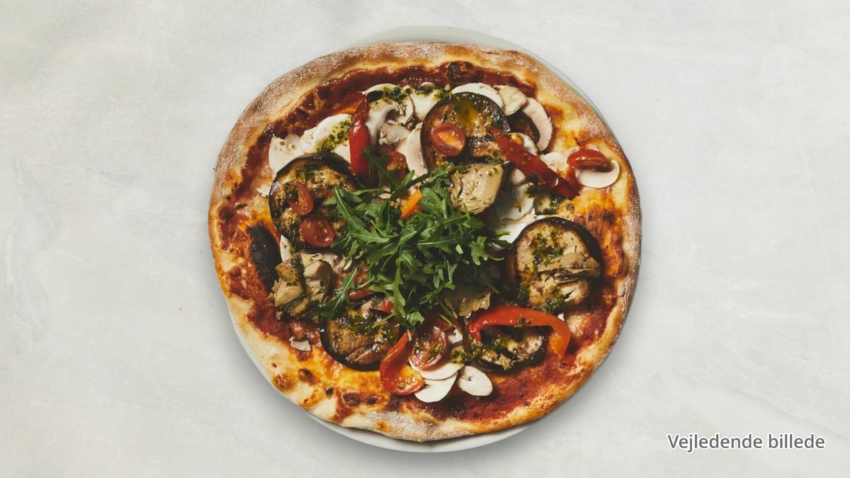 Tomatsauce, ost, aubergine, squash, parmesan.