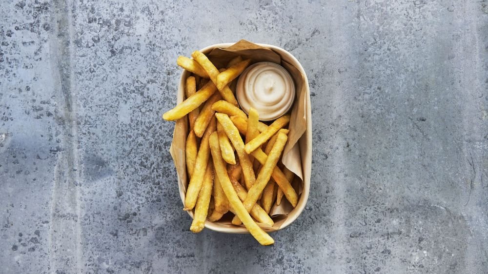Klassiske kartoffel pommes frites, drysset med salt, serveret med dip.
