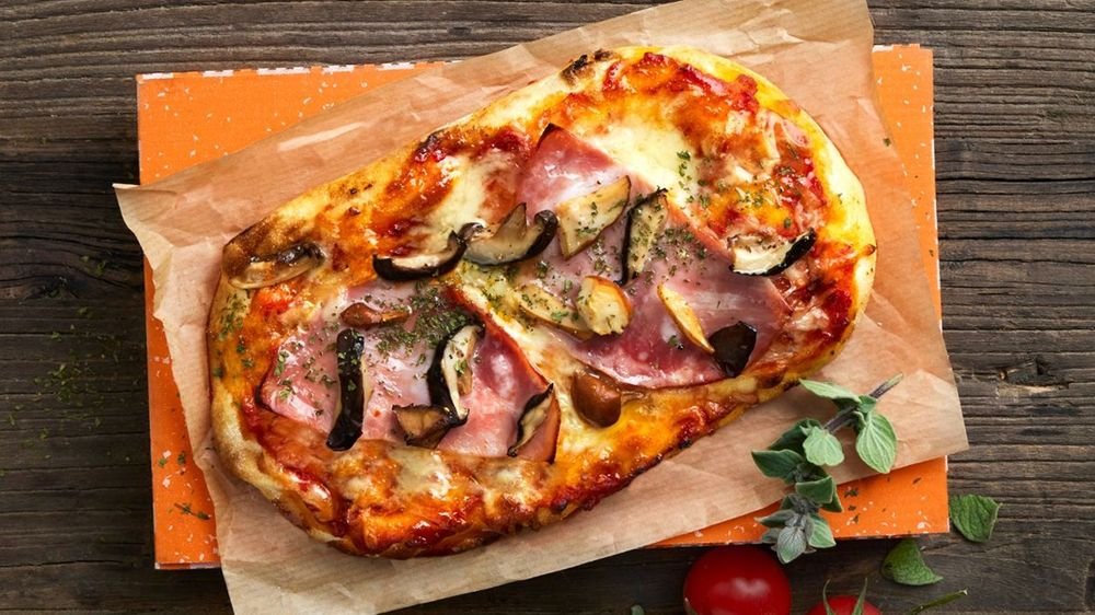 Pizzetta med vilde svampe, snittede tern af kogt og røget dansk skinke, aromatisk tomat sauce og revet mozzarella ost og oregano.