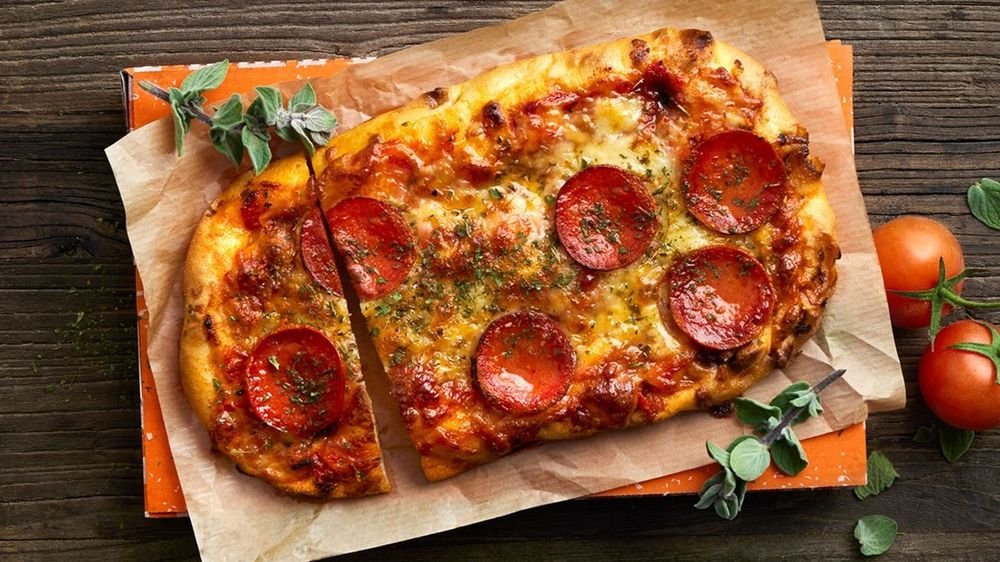 Pizzetta med skiver af pepperoni, aromatisk tomat sauce og revet mozzarella ost og oregano.