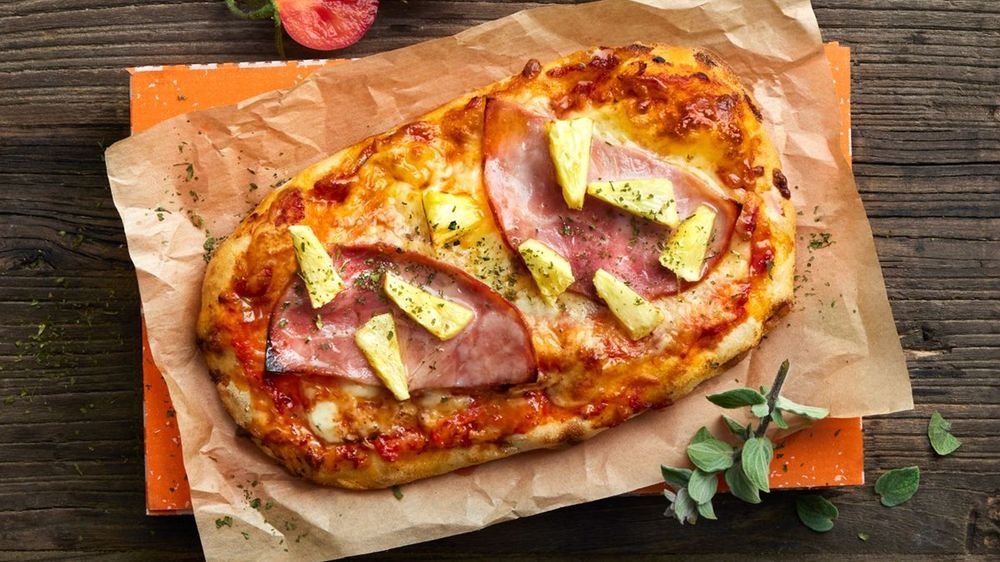 Pizzetta med snittede tern af kogt og røget dansk skinke, ananas, aromatisk tomat sauce og revet mozzarella ost og oregano.