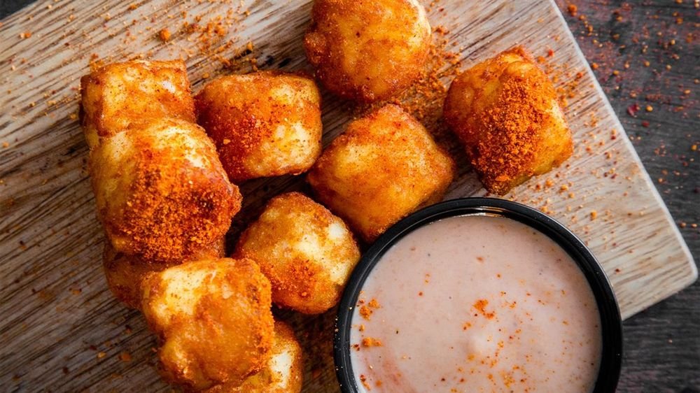 Sprøde kartoffel rösti-kugler drysset med sprængfarlige krudt-krydderier, inklusive valgfri dip.🌶️