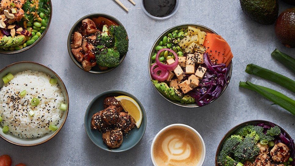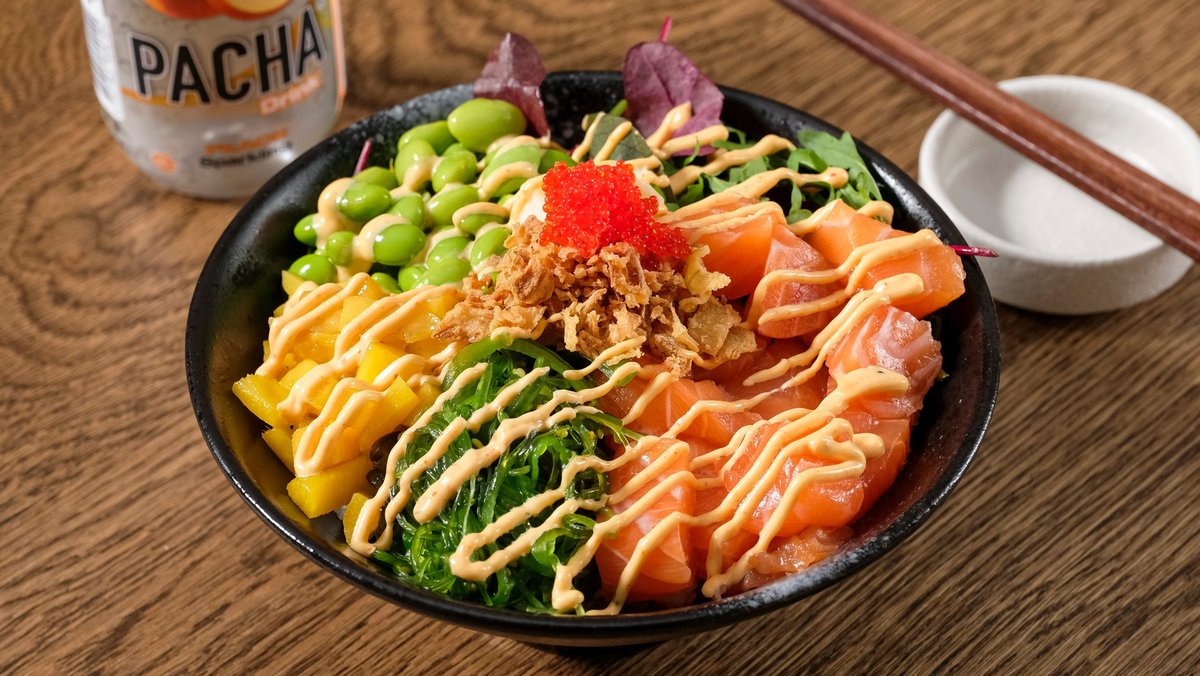 Valgfri poke bowl serveret med én valgri forret og én valgfri 0,33 l sodavand.