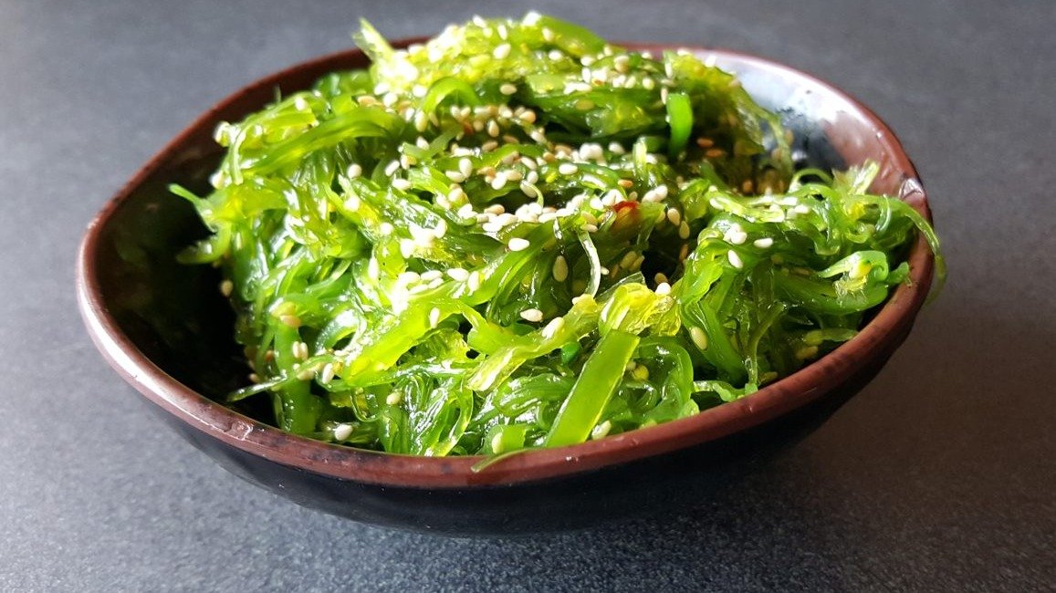 Stegte tigerrejer, avocado, tangsalat, gulerod, edamame, rødløg, cashewnødder og én valgfri dressing på en bund af ris.