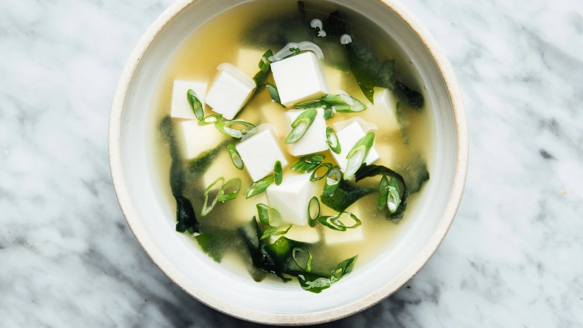 Suppe med tofu, tang, kimchi, laks, foråsløg og sesam.