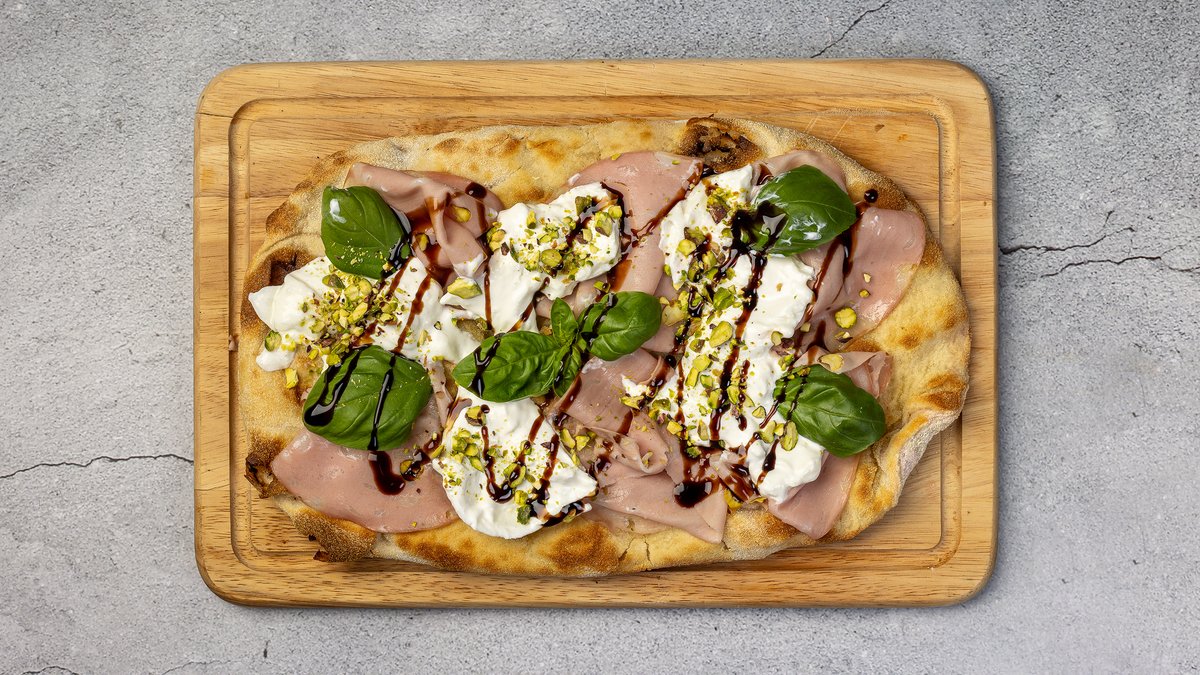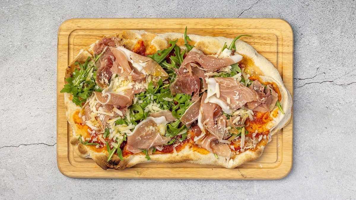 Tomatsauce, klassisk prosciutto, ruccola og parmesan. / Tomato sauce, classic prosciutto, arugula, and parmesan