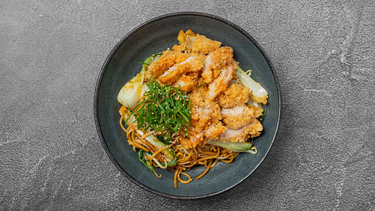 Stegte nudler med østers sovs, bok choy, forårsløg, koriander, bønnespirer og valgfri protein.