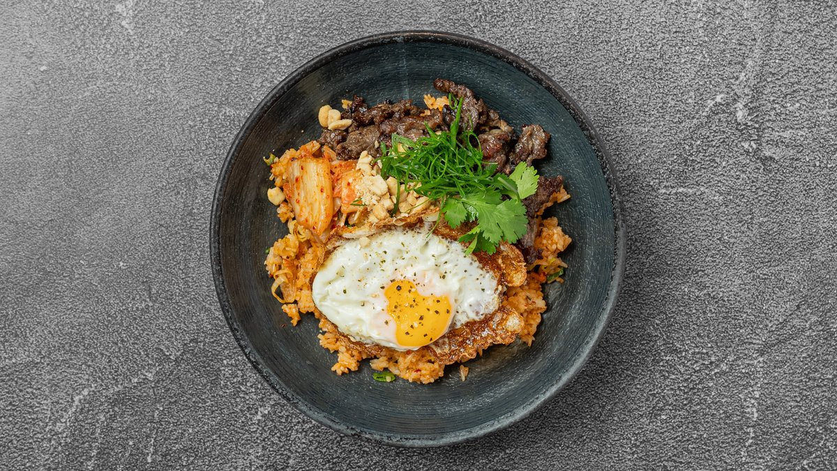 Kimchi stegte ris med oksekød og spejlæg, topped med jordnødder, forårsløg og koriander.