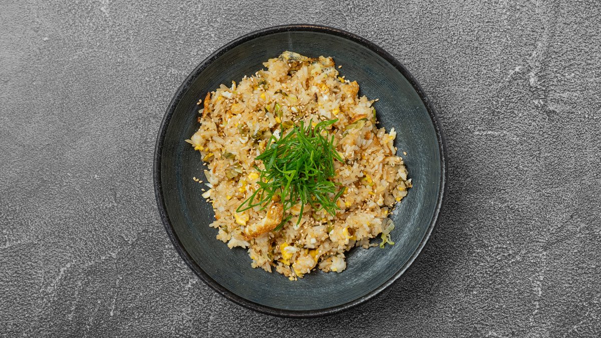 Kinesisk stegte ris med røræg, hvid peber, syltet grønt og forårsløg.