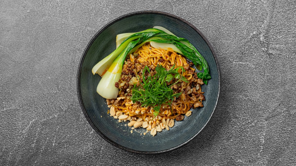 Spicy Sichuan nudler i ristet sesamsovs med hakket svinekød, bok choy, koriander, syltet sennepskål og jordnødder.