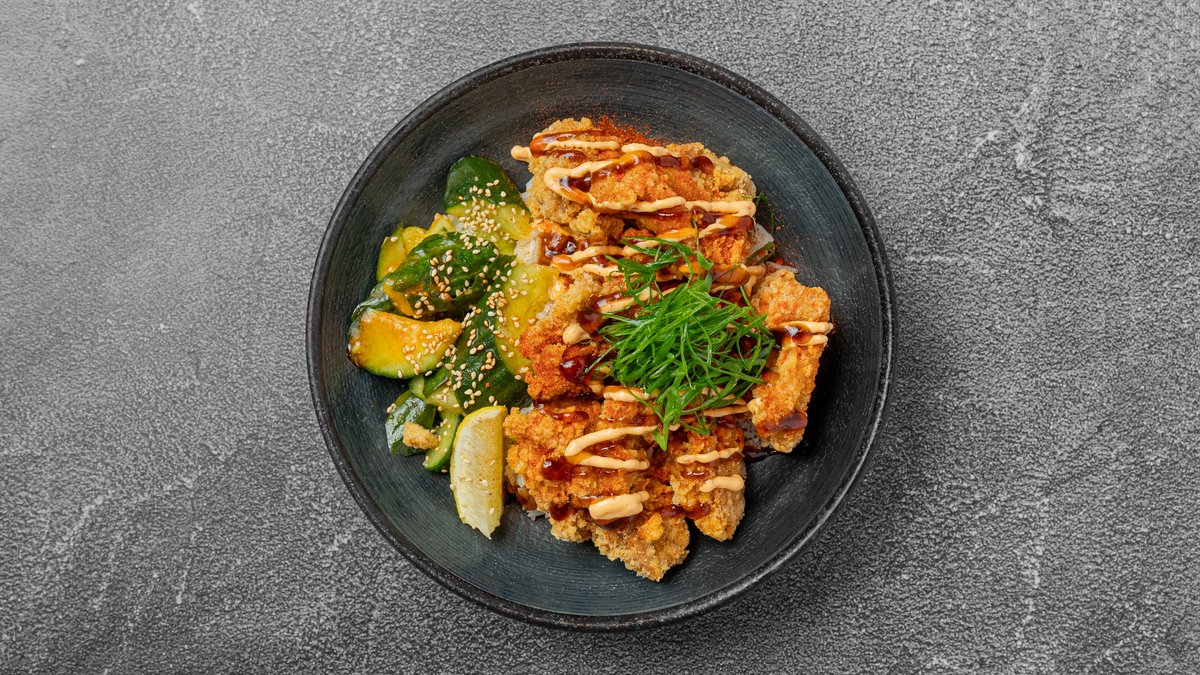 Dybstegte kyllingebowl med Sichuan mayo, teriyaki og agurkesalat serveret med jasminris.