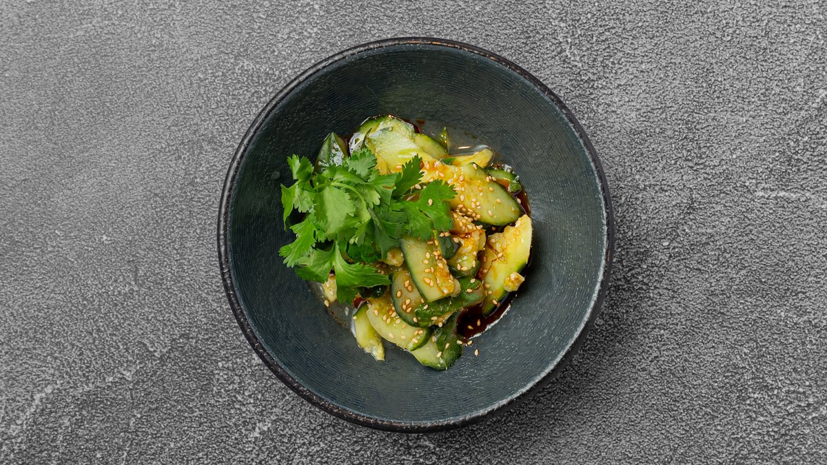 Let syltet agurkesalat med hvidløg og sesamolie.