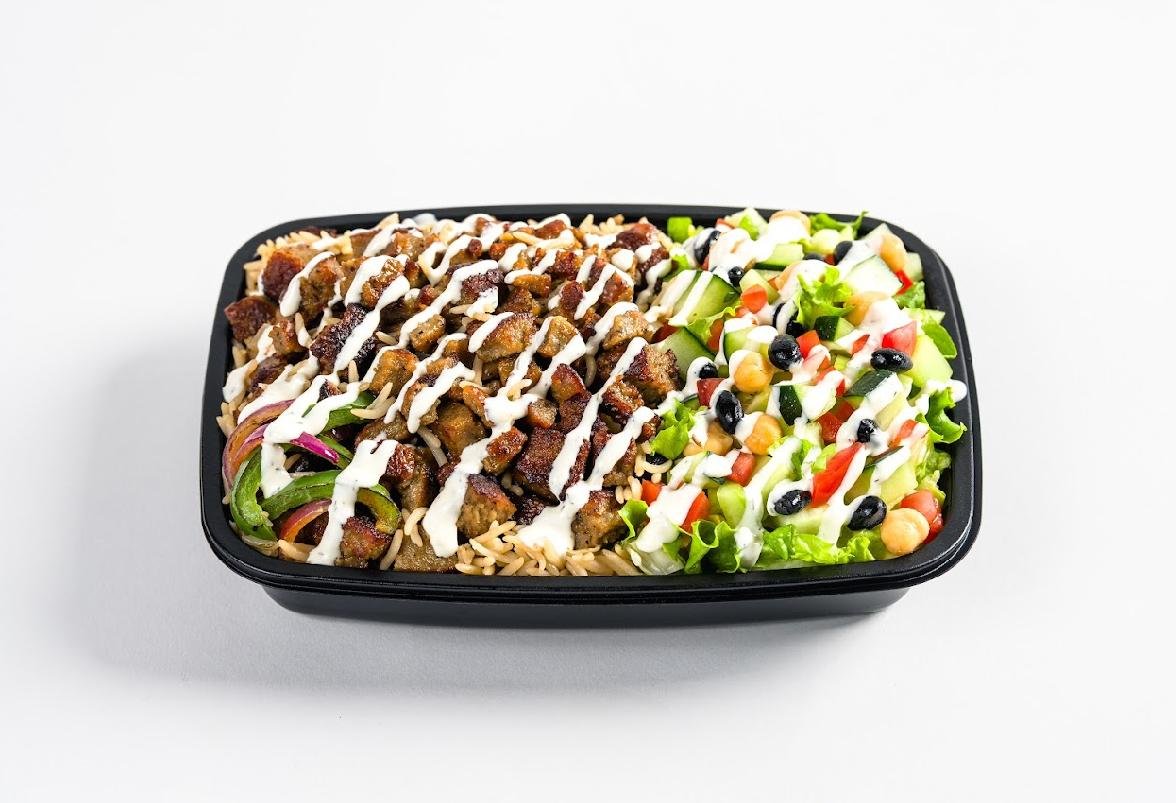 Bund af ris med valgfri protein, valgfri salat og valgfri sauce.