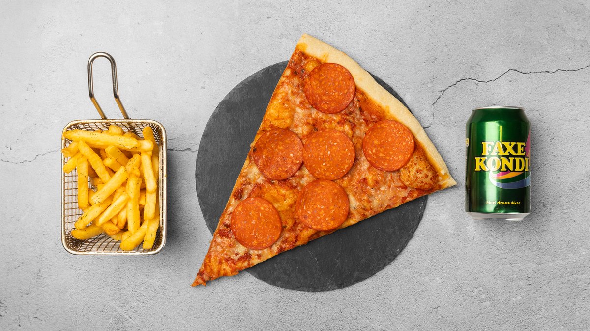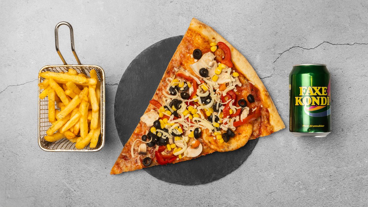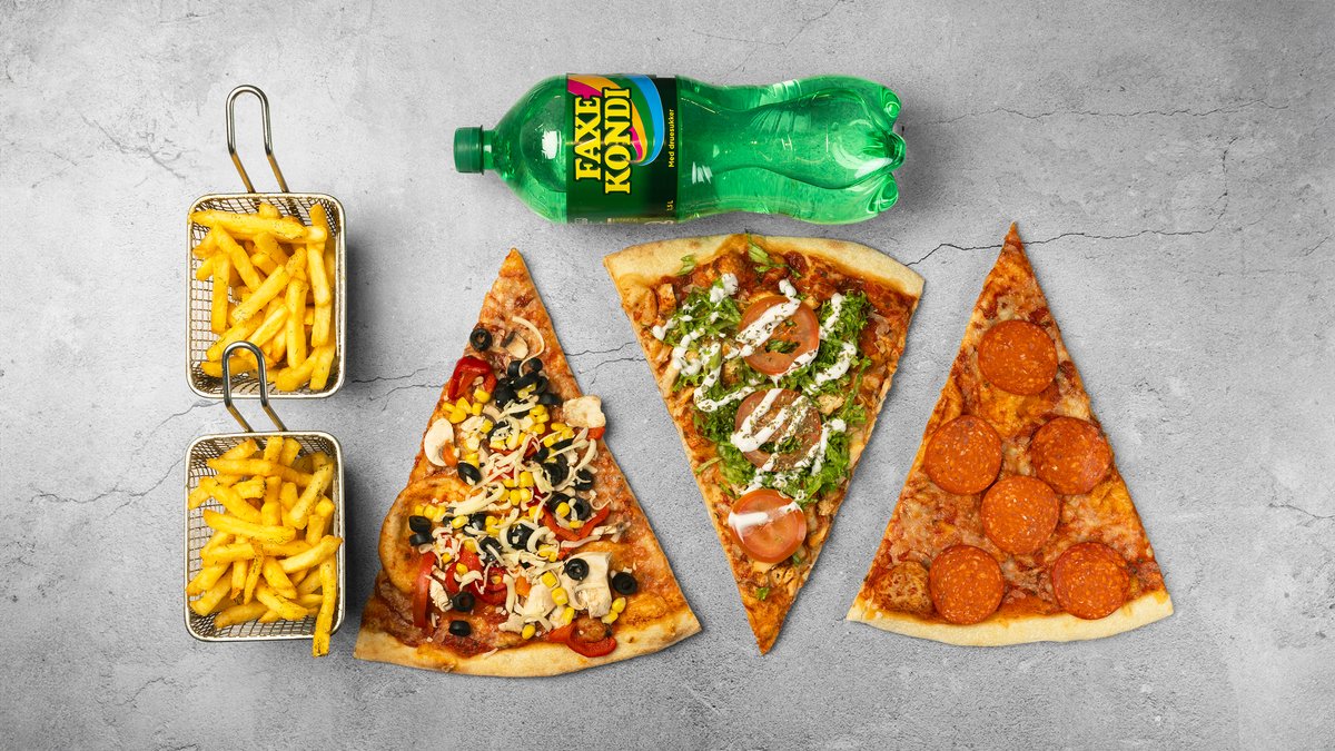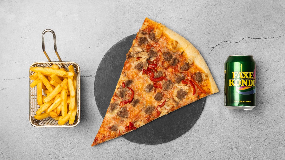 3 valgfrie pizzaslices, 2 x pommes frites og valgfri 1,5 l sodavand.