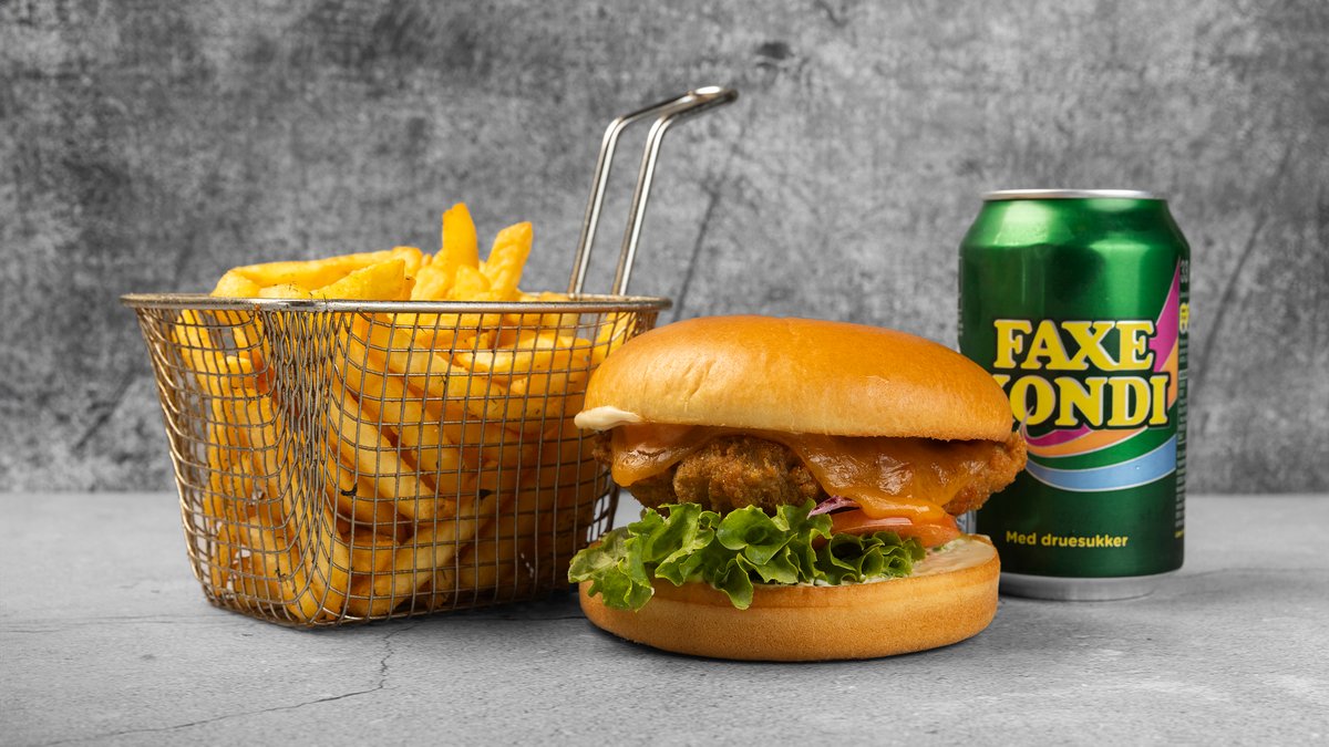 Vegetar burger serveret med pommes frites og valgfri sodavand.