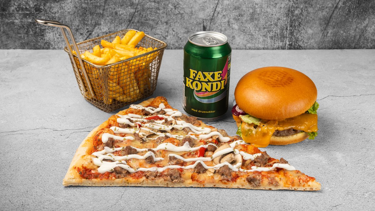 Cheeseburger, valgfri pizzaslice, pommes frites og 2 x 0,33 l sodavand.