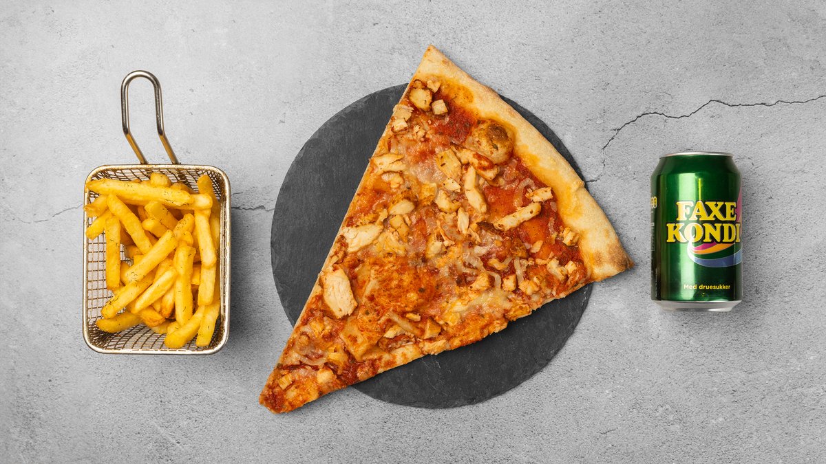 Kylling pizzaslice serveret med pommes frites og valgfri sodavand.