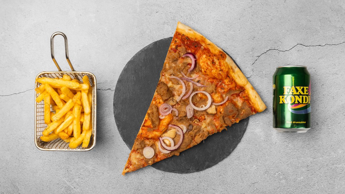 Kebab pizzaslice serveret med pommes frites og valgfri sodavand.