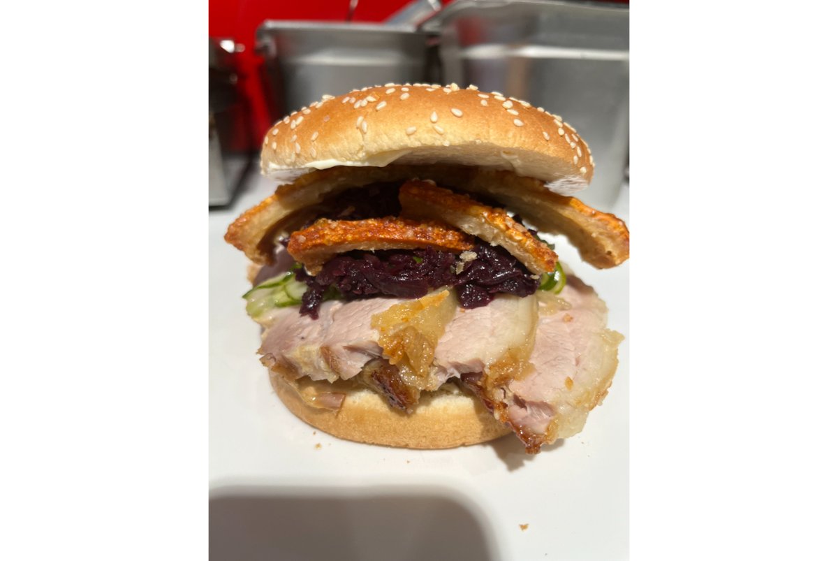 Flæskesteg i burgerbolle med rødkål, agurkesalat og salatmayonnaise.