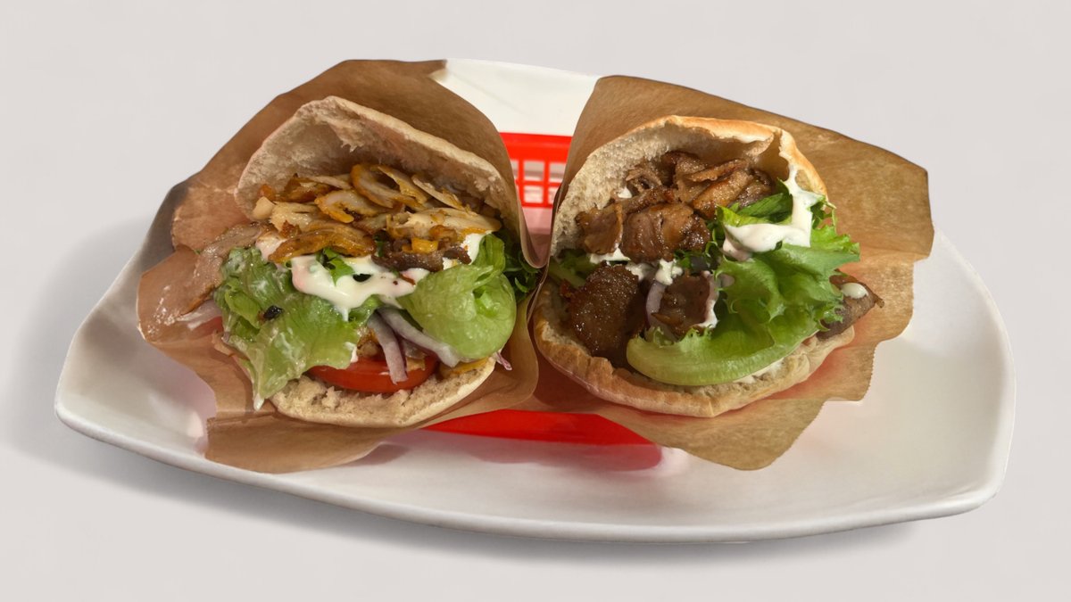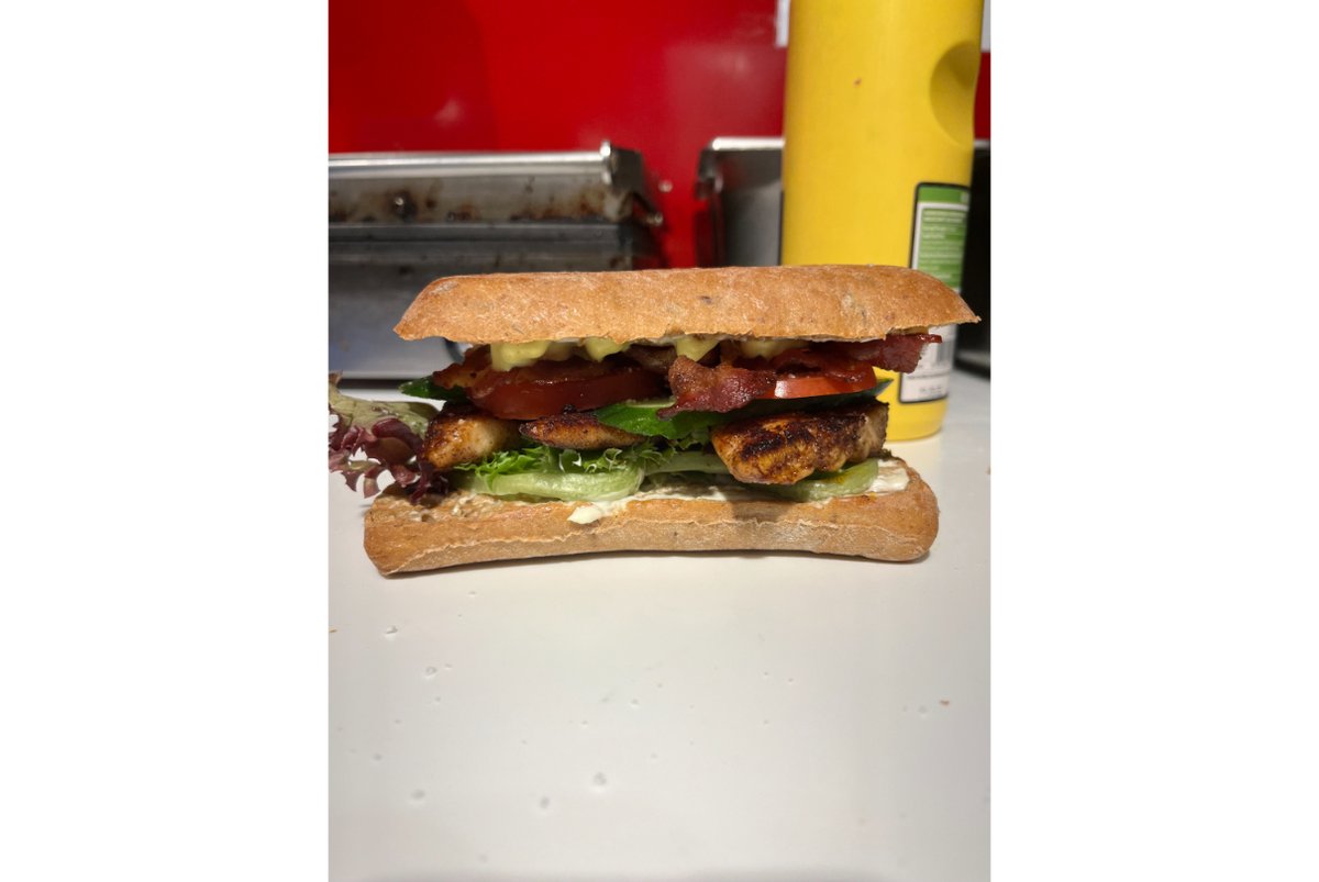 Ciabattabrød med fyld af kylling, salat, rødløg, agurk, tomat, salatmayonnaise og karrydressing.