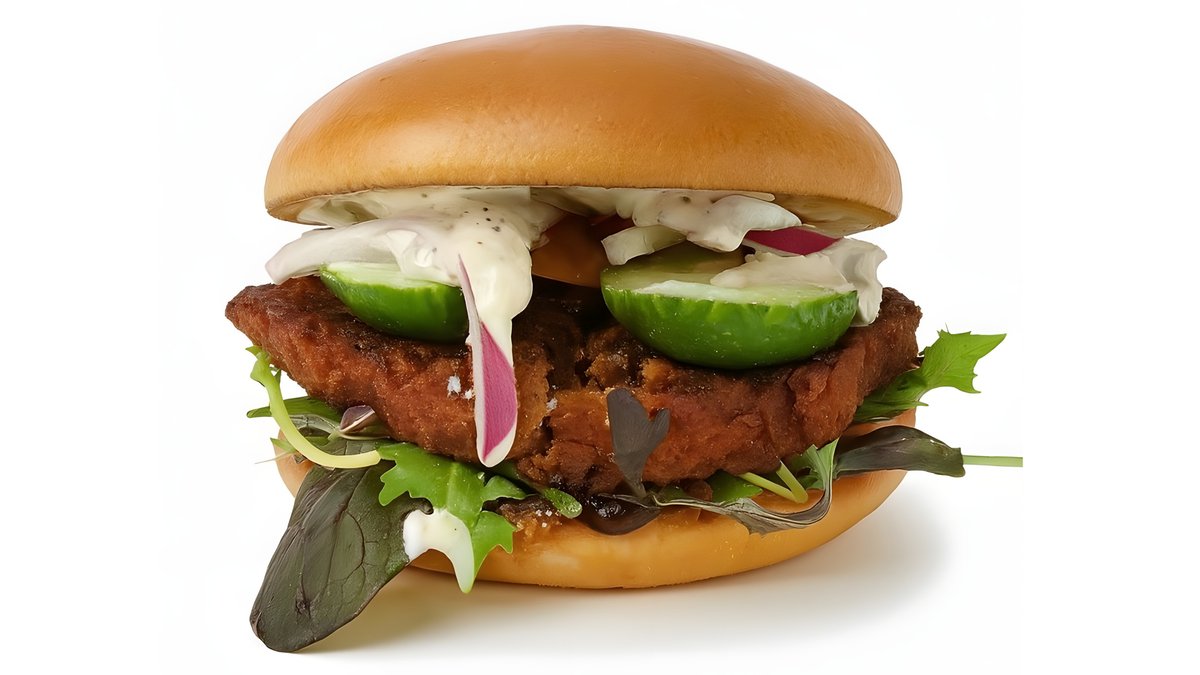 Spød kylling i buffalobolle med salat, tomat, agurk, løg og salatmayonnaise.