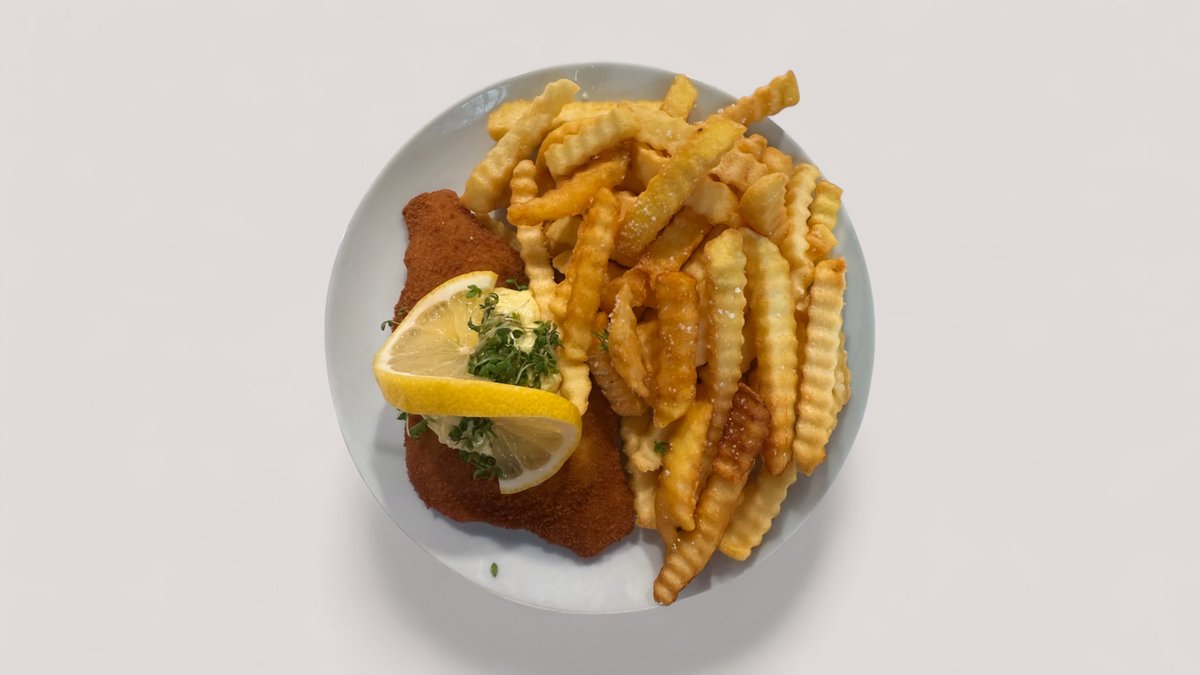 En rødspættefilet med remulade og citron og lækre sprøde bølge pomfritter