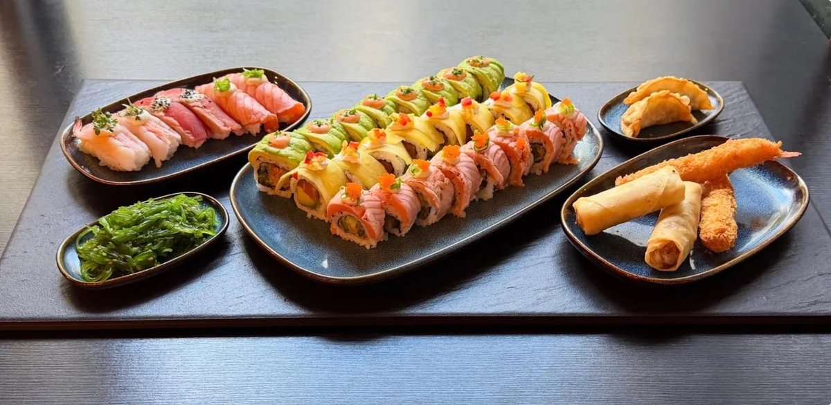 Maki Asparges og avocado toppet med grillet laks, yuzumayo, forårsløg og masagorogn Dybstegte rejer og agurk toppet med avocado, chilimayo og purlløg. Laks og avocado topped mango, mynte og koriander 2 stk grillet laks with soyamayo og forårsløg 2 stk tun tataki med misomayo og sesam 2 stk grillet reje med yuzu mayo og karse 2 x ebi fry med chili mayo 2 x forårsruller med sweet chili 2 x gyoza med Ponzu