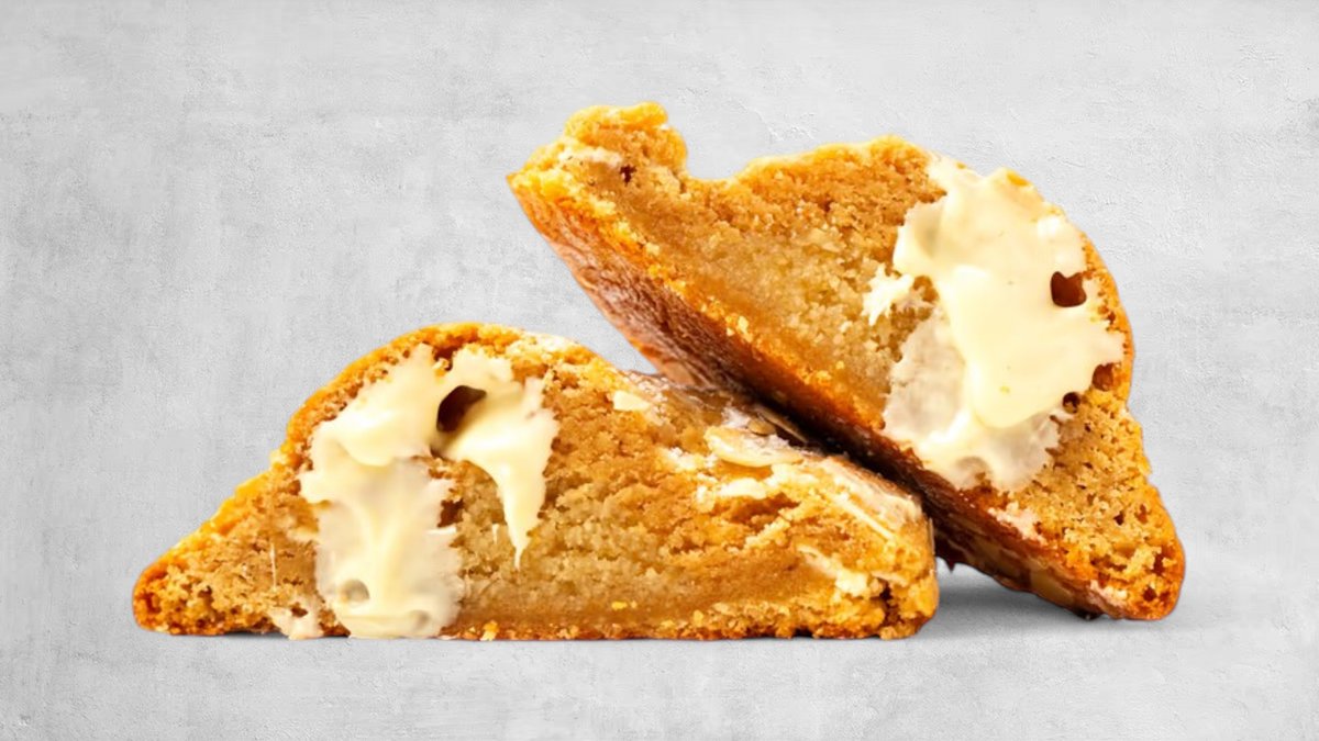 Et stykke cheesecake på en ispind, overtrykket med belgisk mælkechokolade og toppet med cookie stykker. Bunden består af en half baked cookie og chocolate chip Creme cheese.