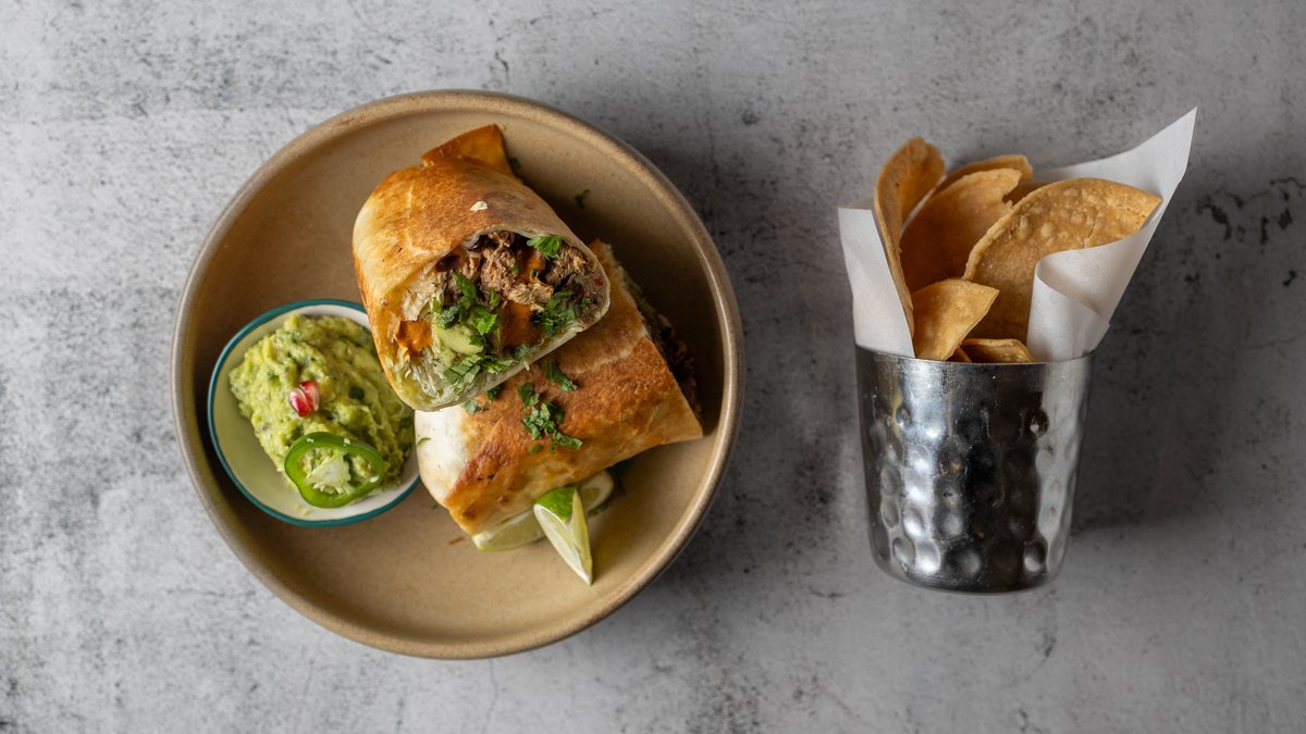 Quesadilla brød rullet med braiseret oksekød, finthakket spidskål, syltede rødløg, krydrede kidneybønner hjemmerørt guacamole, tomatsalsa og chipotlemayonnaise. Serveres med majs chips og guacamole