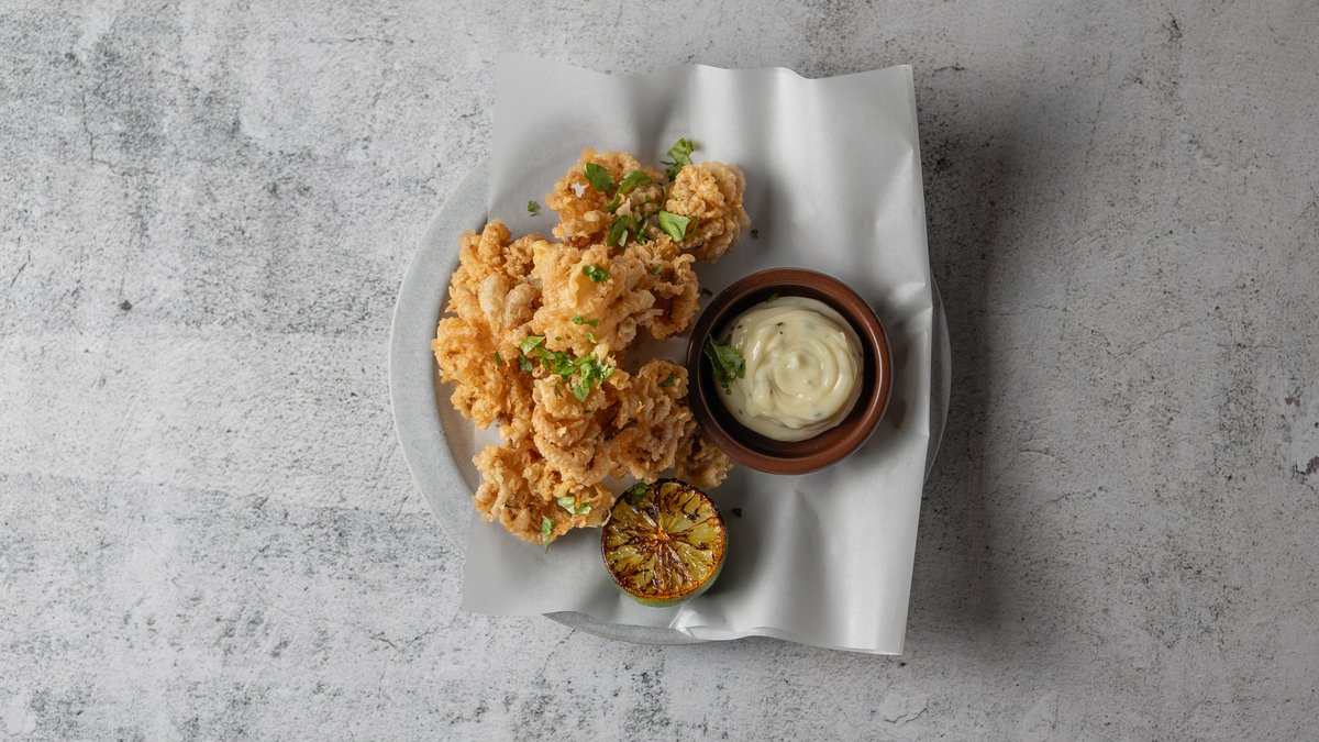 Sprød blæksprutte med hjemmelavet aioli.