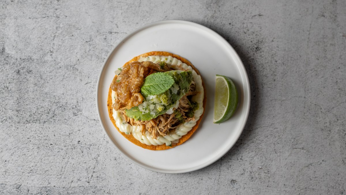 Bløde tacos lavet på blåmajs, med indhold af langtidsbraiseret kylling marineret med røde jalapeños og chili. Toppes med sprødt kyllingeskind, mynte, hjemmerørt guacamole, tomatsalsa og radiser.