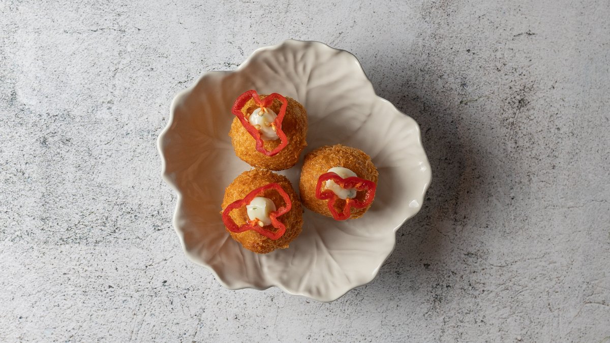 Fritterede og krydrede kartoffelkugler serveret med guacamole.