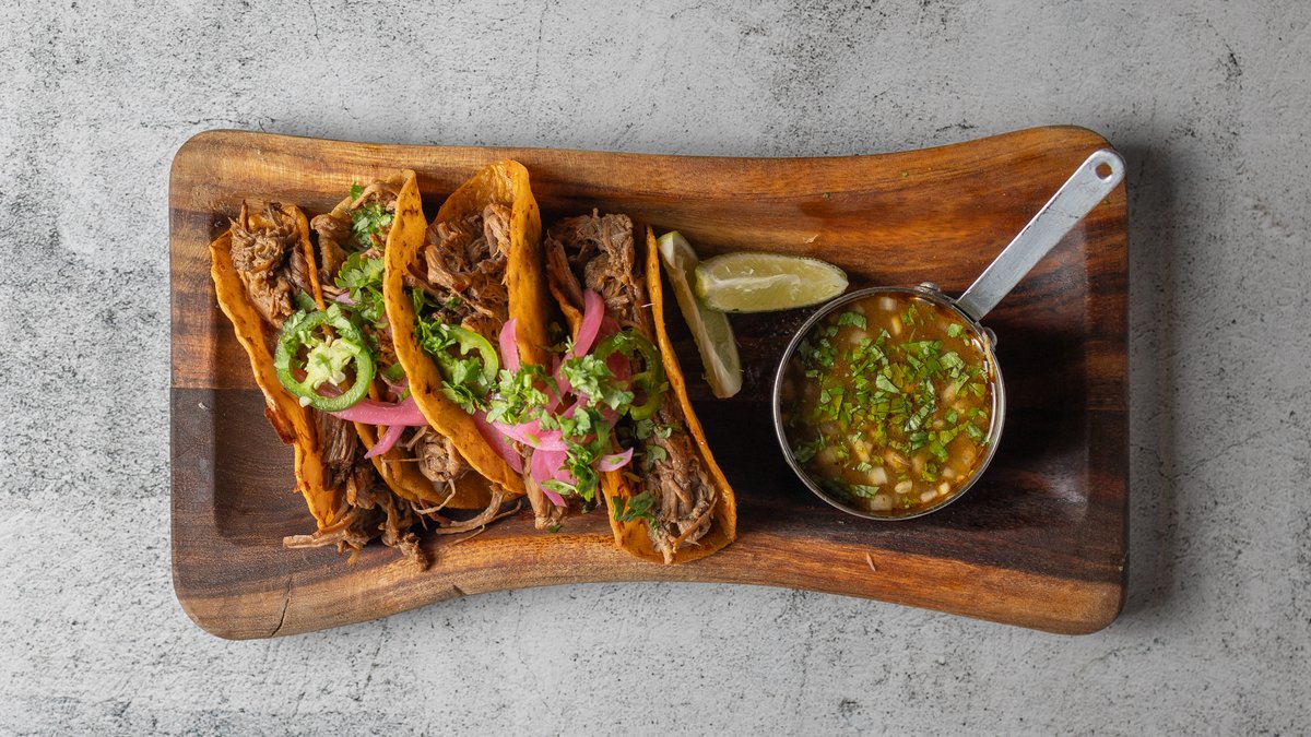 Bløde tacos lavet på blåmajs, med indhold af langtidsbraiseret oksekød marineret i chili- og paprika reduktion. Toppes med syltede rødløg, koriander, paprika salsa og chipotle mayonnaise.