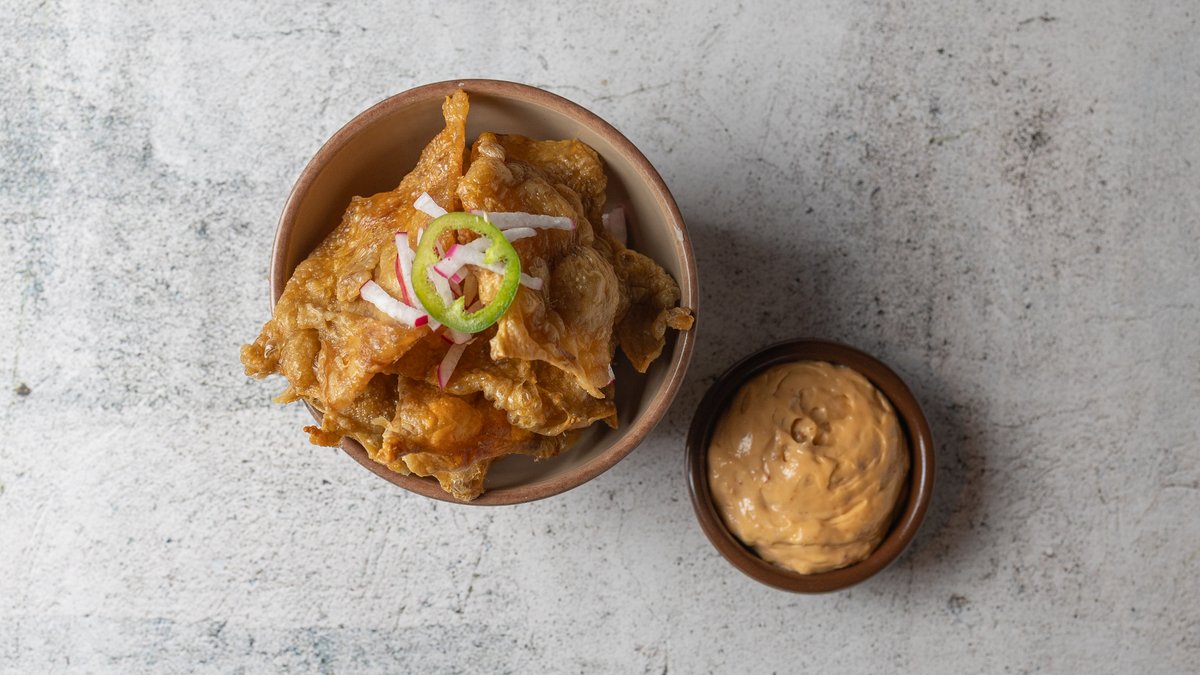 Sprøde chips af bagt kyllingeskind serveret med chipotle mayonnaise.