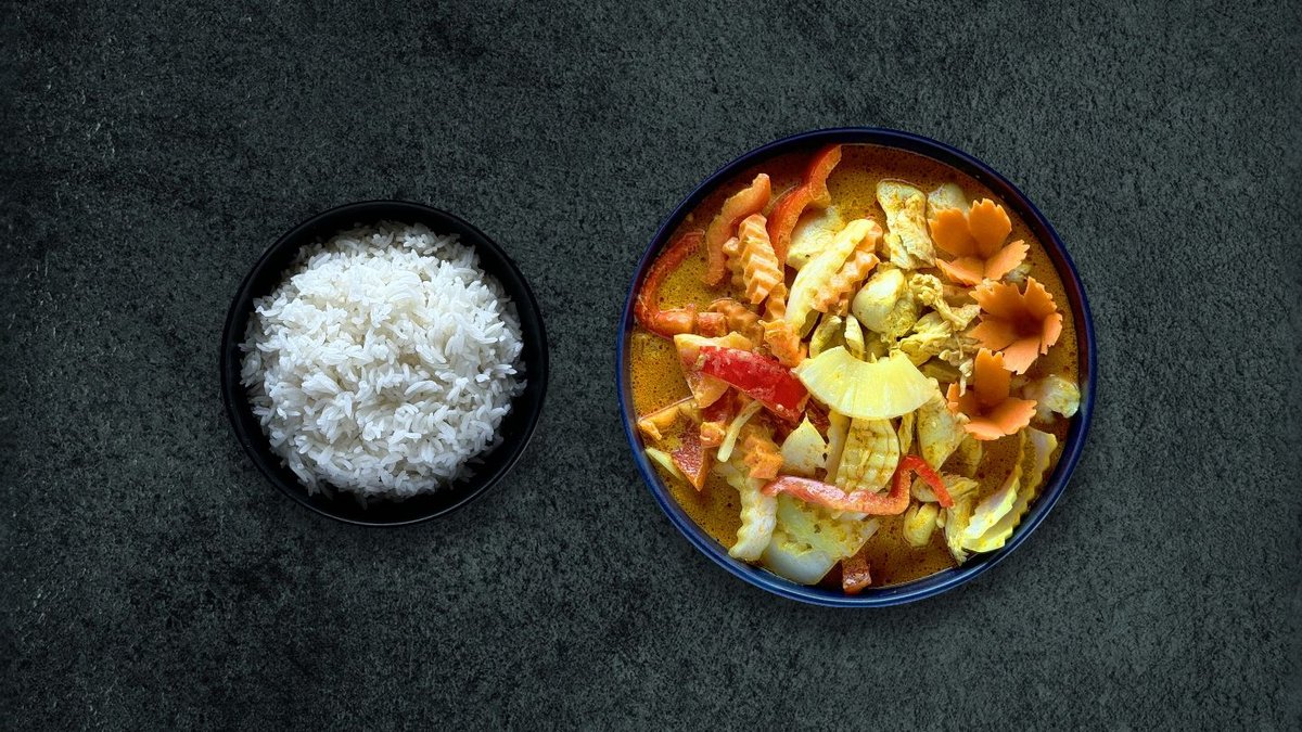 Klassisk indonesisk risret i indisk gul karry med ærter, gulerødder, rød peber og spejlæg. Serveres med ris og valgfri protein.