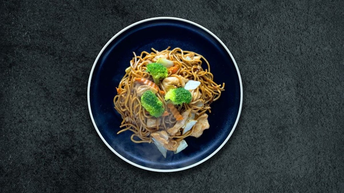 Æggenudler med broccoli, gulerødder, porrer og valgfri protein.