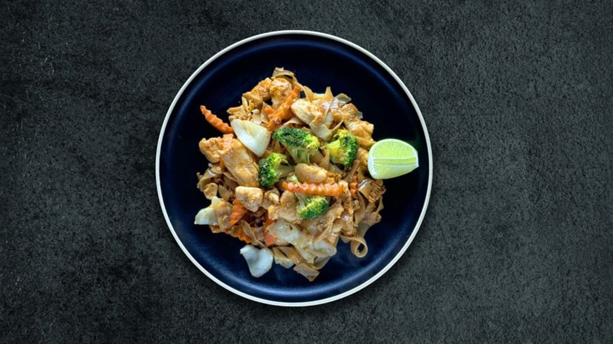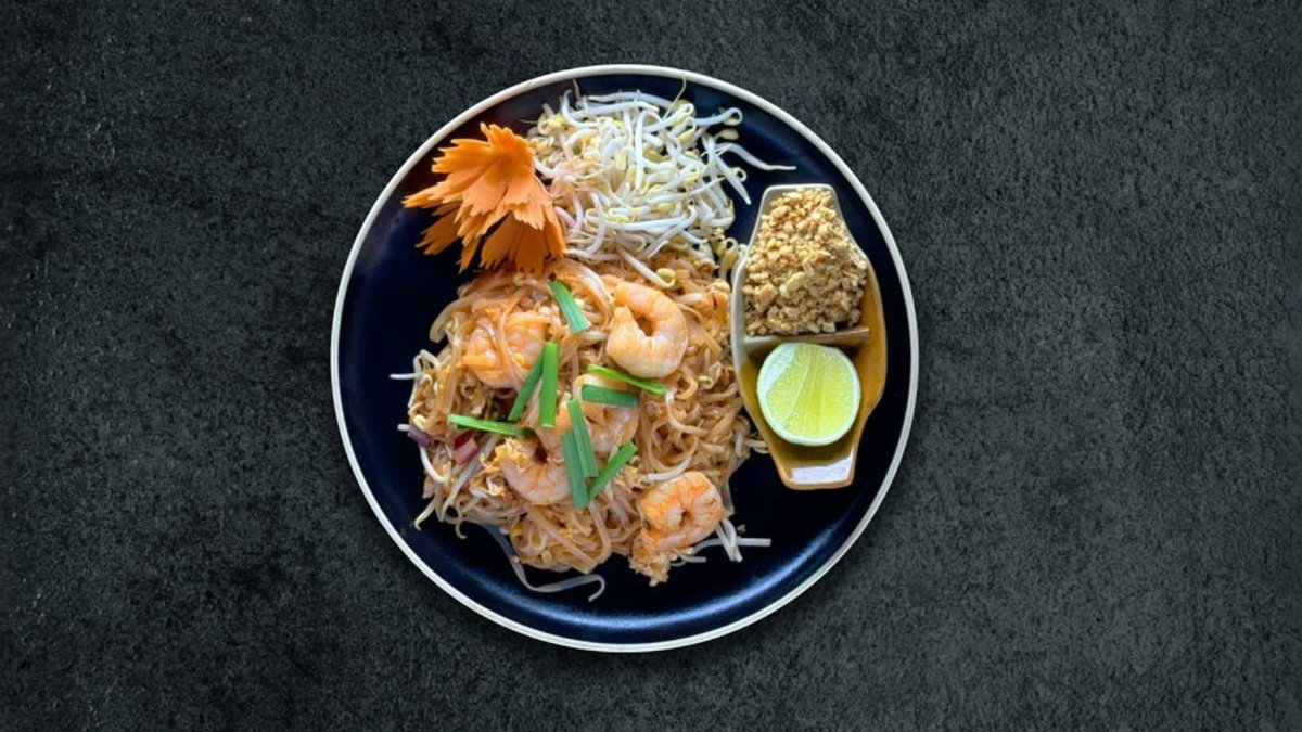 Risnudler med valgfrit protein, friske bønnespirer, hvidløgsblade æg, lime og peanuts.